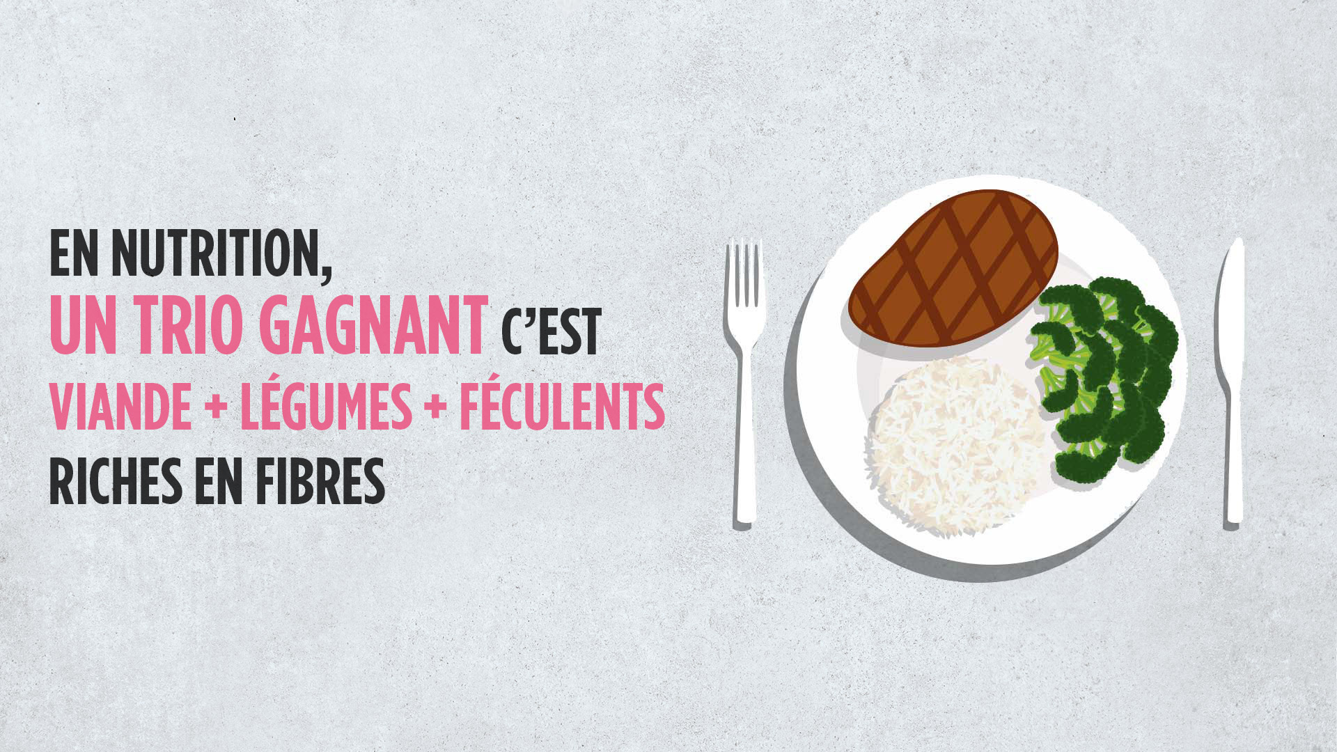 Sources de protéines d’excellente qualité, mais aussi de minéraux (comme le fer) et de vitamines (comme la vitamine B12), les produits animaux sont l’une des 3 composantes du plat principal, aux côtés des légumes et des féculents : c’est pourquoi l’on parle de « trio gagnant ». Une entrée composée de fruits ou de légumes, crus ou cuits, et un produit laitier (en fromage ou dessert) peuvent compléter votre menu pour aboutir à un repas parfaitement équilibré !
