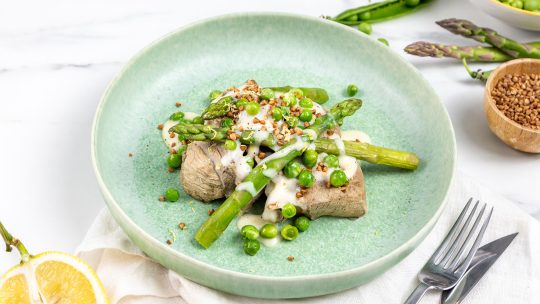 Dans une assiette, déposer les morceaux de viande, les asperges et les petits pois. Napper de crème blanquette et parsemer de sarrasin grillé.