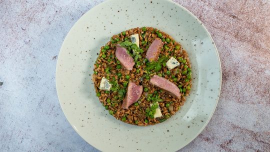 Dans une assiette, déposer les morceaux de viande, les asperges et les petits pois. Napper de crème blanquette et parsemer de sarrasin grillé.