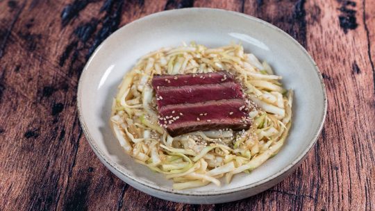 Bowl tataki de bœuf, sauce soja sucrée, boulgour et légumes de saison